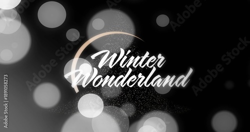 © vectorfusionart, Fototapeta premium Displaying stylized Winter Wonderland text centered on dark banner showing beige arc bokeh sparkles