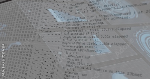 © vectorfusionart, Obraz premium Displaying terminal window on computer monitor at workstation, with hex dump and Nmap scan logs
