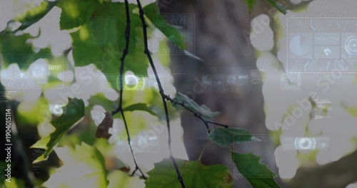 © vectorfusionart, Fototapeta premium Displaying thin diagonal branch showing brown-edged leaf with veins in canopy, with HUD and bokeh