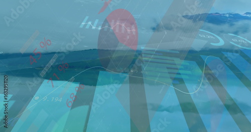 Naklejka premium Displaying translucent data overlay at coastal lake, bar, line, pie charts, % labels, grid lines