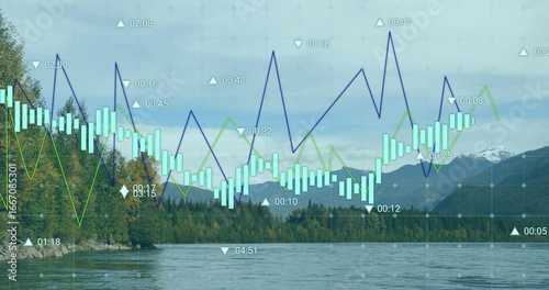 Naklejka premium Displaying translucent financial data overlay across mountain lake scene, with bars and line graphs