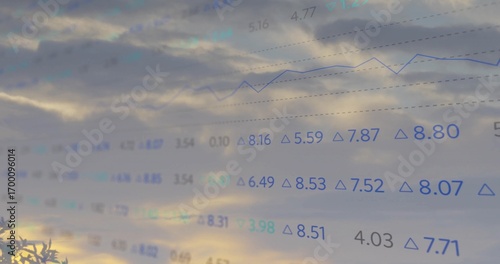 Obraz premium Displaying translucent financial line graph over dusk sky, with numerical...