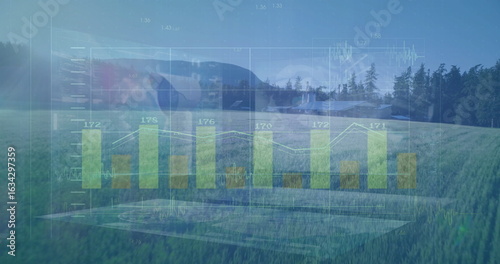 Fototapeta premium Displaying translucent green bar chart with white line graph over rural...