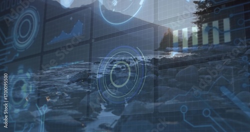 © vectorfusionart, Obraz premium Displaying translucent interface overlay over rocky shoreline at sunset, with HUDs and line charts