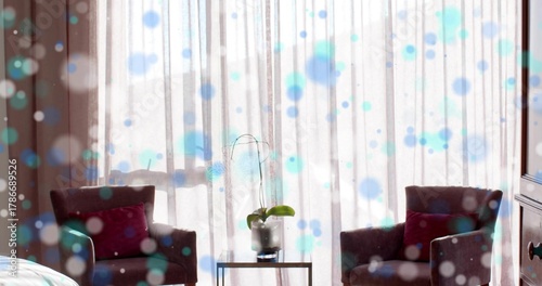 © vectorfusionart, Fototapeta premium Displaying two dark armchairs sitting facing inward in hotel suite sitting area, with potted orchid