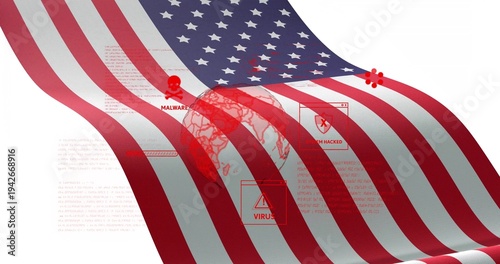 Obraz premium Displaying United States flag draping across white backdrop, with globe, skull icon and alerts
