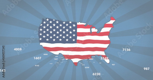 Fototapeta premium Displaying US silhouette filled with American flag pattern on blue radial layout, with data labels