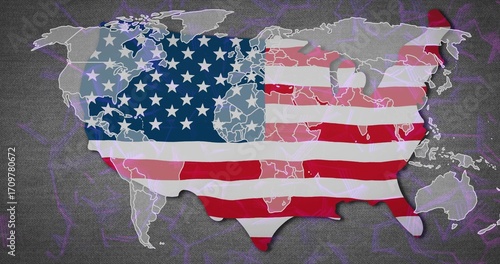 Naklejka premium Displaying US silhouette with flag pattern on dark background, featuring world map and purple veins