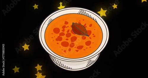 © vectorfusionart, Obraz premium Displaying white bowl holding orange soup with bay leaf against cosmic backdrop, golden stars