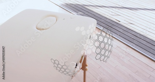 © vectorfusionart, Obraz premium Displaying white oval pod mounted on wooden tripod in modern interior, showing hexagonal panels