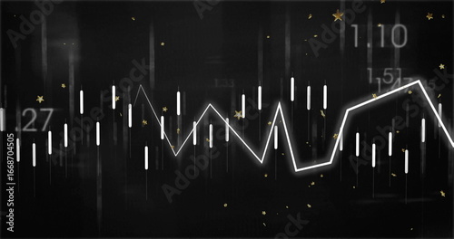 Fototapeta premium Displaying white zigzag trend line on dark dashboard with candlestick bars, figures and gold stars