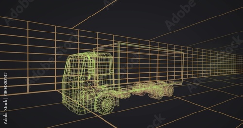 Fototapeta premium Displaying wireframe box truck occupying 3D studio, with neon green lines and...