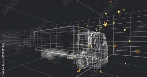 © vectorfusionart, Obraz premium Displaying wireframe cargo truck occupying center of virtual grid space, with floating golden stars