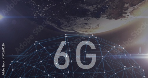 Fototapeta premium Displaying wireframe geodesic dome with white node points and 6G label over planet limb