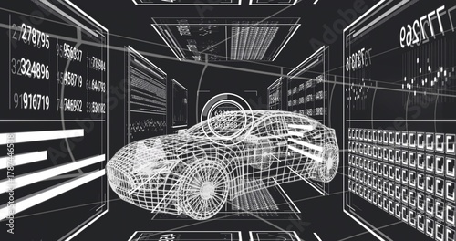 Naklejka premium Displaying wireframe sports car rotating inside virtual lab, with HUD reticle and data panels