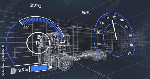 © vectorfusionart, Fototapeta premium Displaying wireframe truck model moving on dark 3D grid interface, power gauge and speedometer