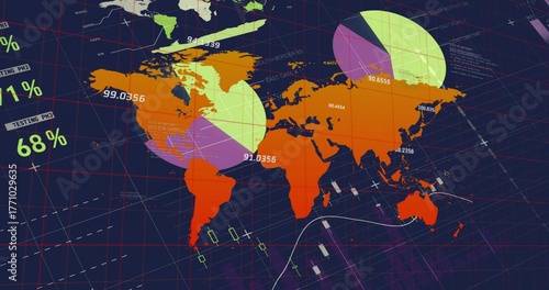 Obraz premium Displaying world map with pie charts and dashboard metrics on grid, showing...