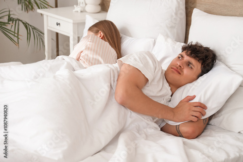 Fototapeta premium Displeased young man with his wife lying in bedroom. Sexual problems concept