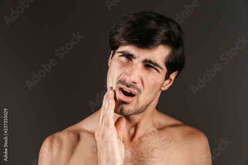 © Drobot Dean, Obraz premium Displeased young man with toothache posing isolated over dark wall background.