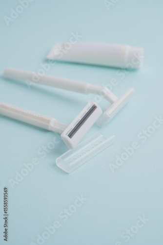 © Iuliia Pilipeichenko, Naklejka premium Disposable plastic razor with steel blade, men's and women's razors and shaving cream. Skin and body care concept. Depilation. Space for text