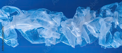 © Gular, Obraz premium Disposable waste plastic on blue background Top view Copy space