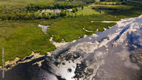 © wayker, Fototapeta premium Distant aerial view of a wetland and forest in summer