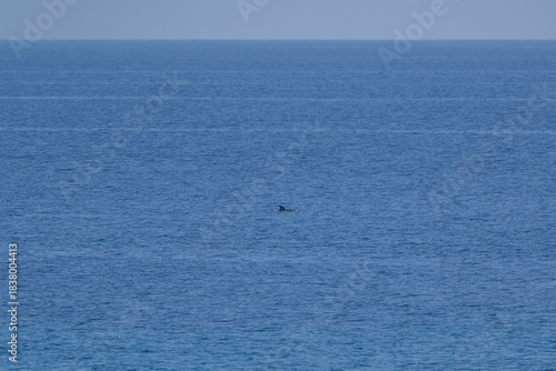 © Michal Plevko, Fototapeta premium Distant dolphin surfacing in open sea under clear sky