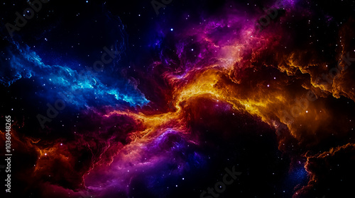 Fototapeta premium Distant galaxy, swirling clouds of gas and dust illuminated by vibrant colors, deep space background.