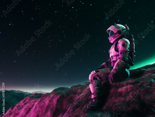 Fototapeta premium Distant Horizons: An Astronaut's Quiet Moment on the Surface of an Alien World, Looking into Space.