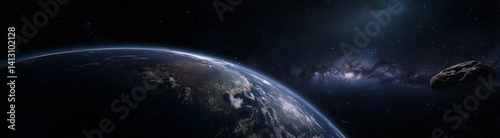 © Stanley, Fototapeta premium Distant Planet Earth: A celestial landscape showcases Earth from a unique perspective, offering a breathtaking view of the planet set against the vastness of the cosmos.