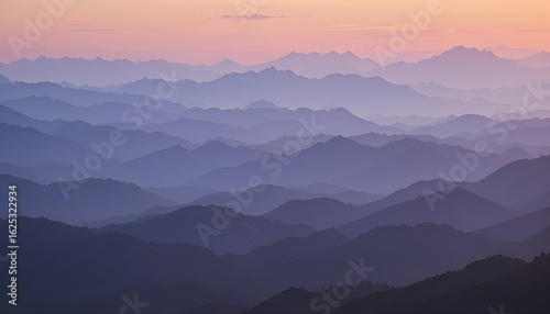 © Muneeb, Obraz premium Distant Ridge Silhouette at Sunset: Layers of Blue and Purple Mountains