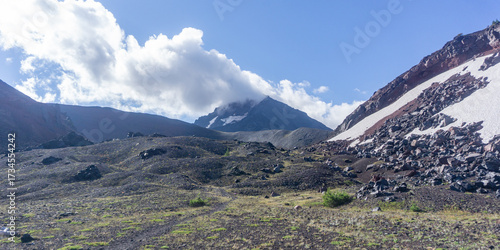 © Rodrigo, Fototapeta premium Distant snow-capped mountains behind green forest ridge under clear sky