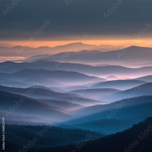 © shiyi, Fototapeta premium Distant sunrise over mountains with orange red sky and dramatic clouds, wide angle cinematic landscape view, flying bird above black hills, white fog and glowing horizon creating mysterious atmosphere