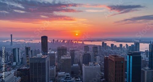© Earl, Fototapeta premium Distant sunset view from a highrise office with panoramic city skyline