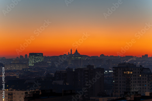© davidzzzfr, Fototapeta premium Distant view of Sacre Coeur Basilica on Montmartre before sunrise