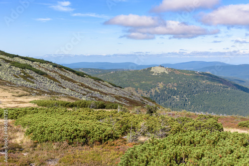 © mkos83, Fototapeta premium Distant view of Szrenica shelter from Labski Szczyt mountain