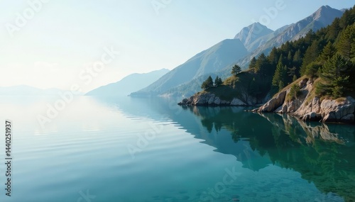 Fototapeta premium Distinctive shoreline, irregular shape mirrored in calm water, shape,...