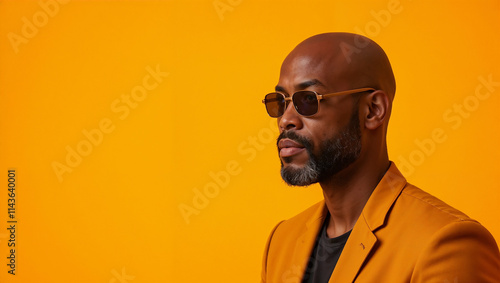 © InspirationDesign, Fototapeta premium Distinguished African American man in brown blazer with sunglasses against yellow background
