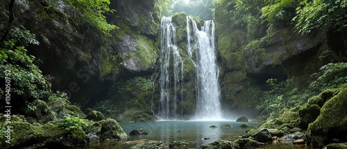 © Maneerat, Fototapeta premium Distorted image of a waterfall amidst dense foliage with moss and lichen growing on the rocks, foliage, lichen