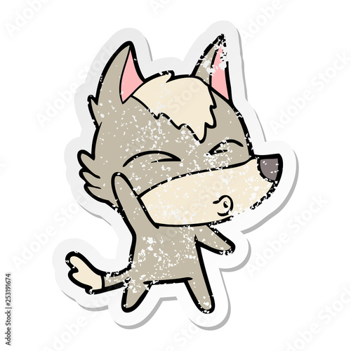 Obraz premium distressed sticker of a cartoon waving wolf whistling