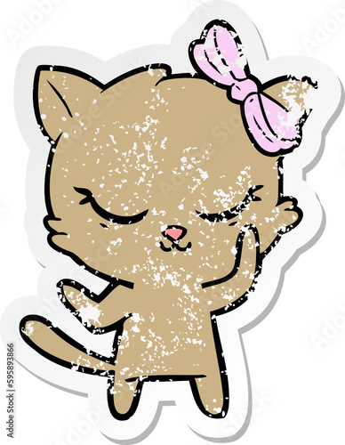 © lineartestpilot, Fototapeta premium distressed sticker of a cute cartoon cat with bow