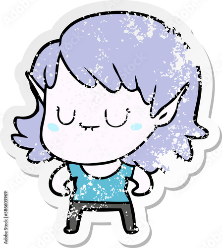 © lineartestpilot, Fototapeta premium distressed sticker of a happy cartoon elf girl