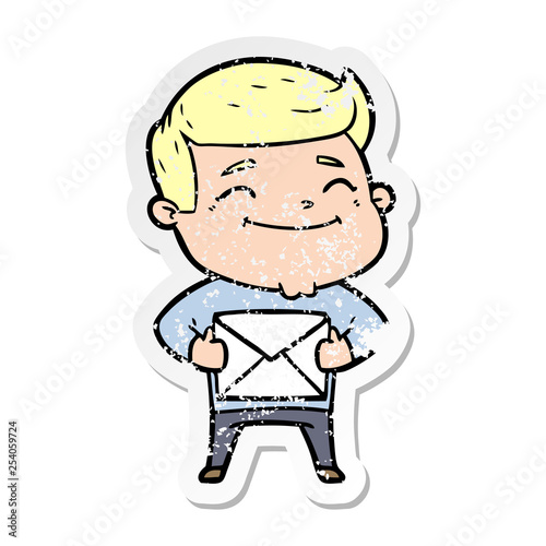 Obraz premium distressed sticker of a happy cartoon man with parcel