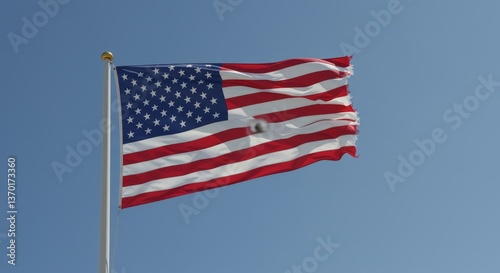 © dedy, Fototapeta premium Distressed United States Flag Waving Against Azure Sky, symbolizing resilience