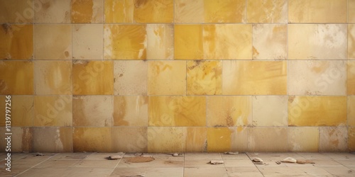 © Patchanee, Obraz premium Distressed yellow and beige tile wall background, texture, earthy