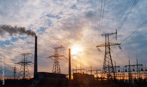Fototapeta premium distribution electric substation with power lines and transformers, at sunset
