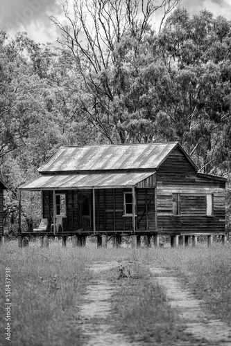 © Photopia Studio, Obraz premium Disused wooden homestead surrounded by grazing field and dramatic stormy sky in Kroombit Tops National Park, Queensland