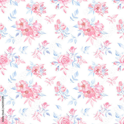 © FlowersForBear, Obraz premium Ditsy pattern with the pink roses and blue leaves on a transparent background. Pastel color palette, elements are painted with watercolors. For the home textile, kids clothing, wrapping paper