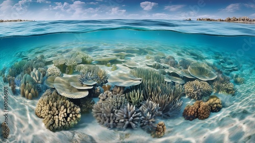© Ameer, Naklejka premium Dive into a world of wonder with ultra-realistic 4K backgrounds that showcase the breathtaking beauty of coral reefs. The scene unveils an underwater paradise, coral reef and sea, Generative AI