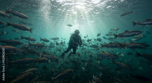 © Casper, Fototapeta premium Diver Among Atlantic Salmon in Open Ocean